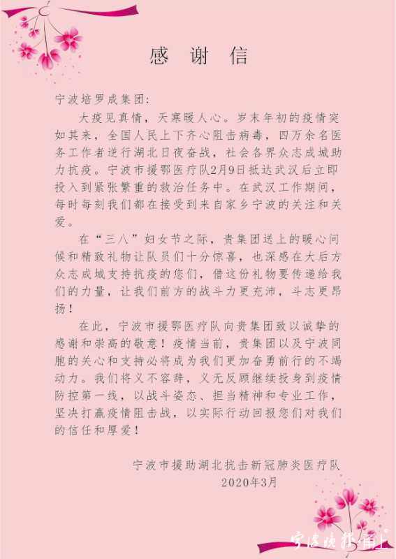 7日深夜,公司收到了一封來(lái)自寧波市援助湖北抗擊新冠肺炎疫情醫(yī)療隊(duì)的感謝信。