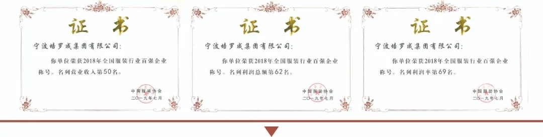2018年中國服裝行業(yè)百強(qiáng)企業(yè)根據(jù)“會(huì)員參與、自愿申報(bào)”的原則,分別對(duì)“營業(yè)收入”“利潤總額”和“利潤率”三項(xiàng)指標(biāo)進(jìn)行排序,培羅成集團(tuán)再度榮獲2018年度“中國服裝行業(yè)百強(qiáng)企業(yè)”稱號(hào)。